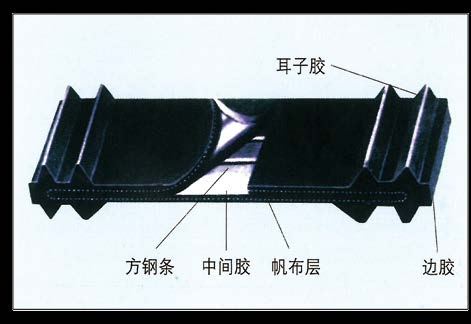 It is divided into: ordinary steel wire rope traction conveyor belt and flame retardant steel wire rope traction conveyor belt. It laterally lays the square steel bar along the adhesive tape, which is filled with rubber, covered with adhesive tape to form core and covered with upper and lower covers. Ear glue and side glue are set on both sides of the belt body.
