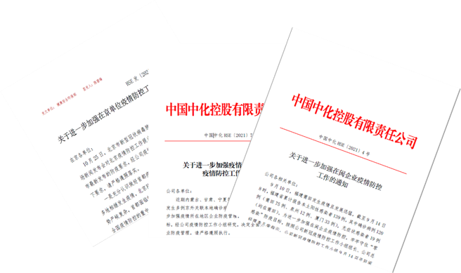 全面升级疫情所在地企业防疫管理。针对复杂的疫情发展态势,中国中化党组高度重视,疫情防控工作领导小组结合实际研究制定针对性防控举措,统筹推动各级抓实防疫工作。针对福建突发疫情,9月15日印发《关于进一步加强在闽企业疫情防控工作的通知》,全面升级在闽企业疫情防控工作要求。针对国庆期间人员流动性大、部分地区确诊病例仍未清零的情况,9月29日印发《关于做好国庆节期间疫情防控工作的通知》,明确8项防疫工作具体要求。围绕充分做好参加进博会筹备工作,研究制定《中国中化参加第四届中国国际进口博览会疫情防控工作方案》,制定抵沪前、在沪期间防疫举措并坚决贯彻落实。