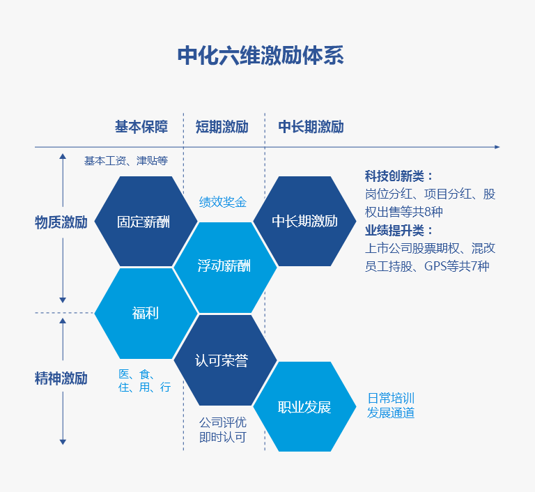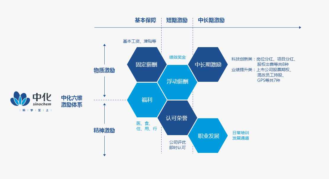 中国中化秉承“在坚持国有企业属性前提下、无限接近市场化”的激励理念,秉承“为岗位付薪、为能力付薪、为绩效付薪”相结合的3P付薪原则,不断完善自身多元化激励机制,搭建短中长期相结合、物质与非物质相结合的“六维激励体系”。