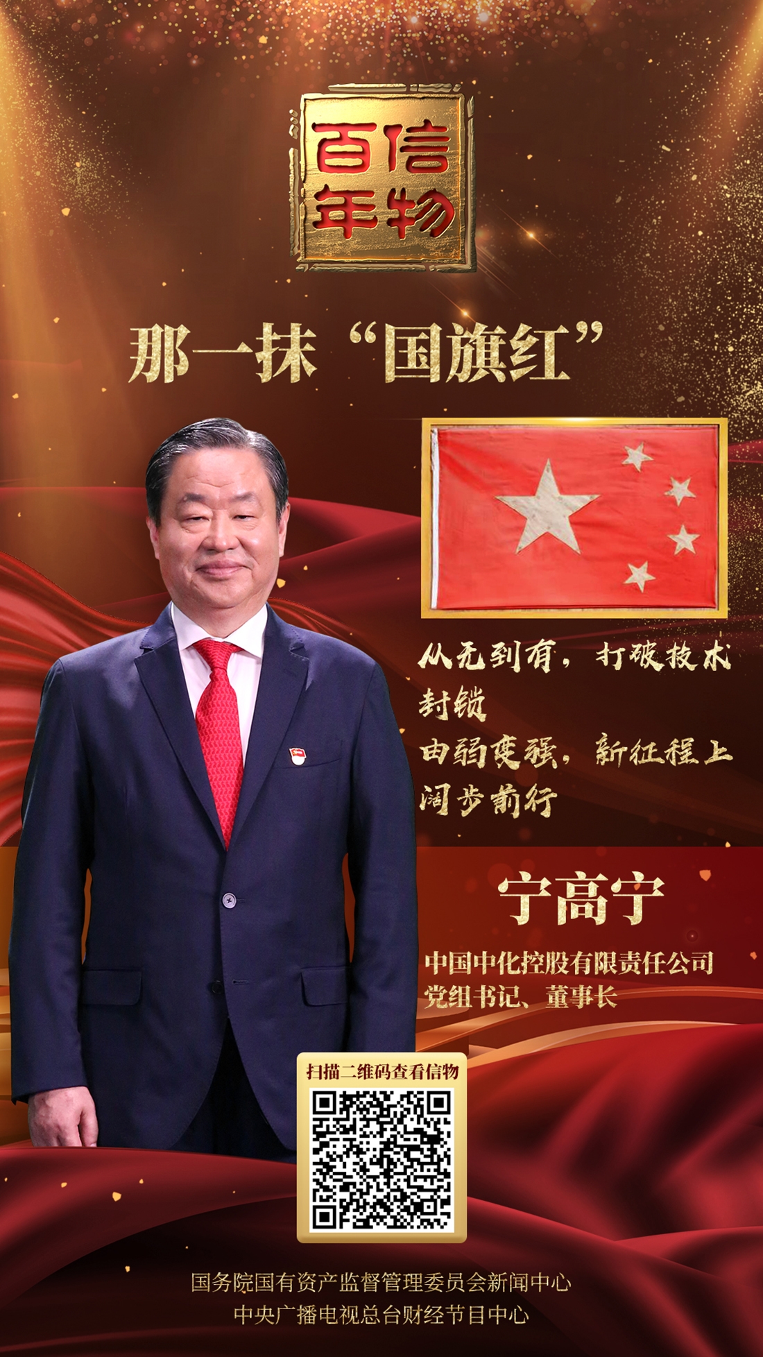 6月30日晚,中央广播电视总台《信物百年》纪录片播出《新中国第一份“国旗红”染料》,中国中化党组书记、董事长宁高宁应邀讲述中化研制“国旗红”染料背后的故事,生动展现中国化学工业的巨变。