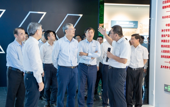 在崖州湾种子实验室,李凡荣一行沿着习近平总书记2022年南繁考察足迹,重温习近平总书记重要讲话并与种业研发骨干座谈交流。