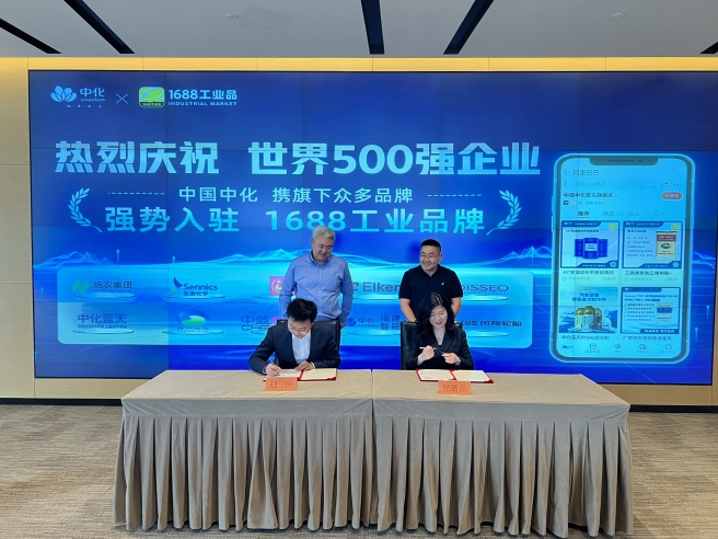 5月16日,中国中化与阿里1688在浙江杭州共同举办中国中化1688 官方旗舰店上线仪式,并由中化信息与阿里1688 签署《合作备忘录》。 中国中化1688官方旗舰店首批上架了来自旗下扬农集团、圣奥化学、南通星辰、星火有机硅、安迪苏、中化蓝天、沧 州大化、福建天华、风神轮胎、德州实华等25家企业的450余款重点产品,涉及农业和动物营养、交通运输、电子电气、新 能源、建筑与基础设施、皮革纺织、环境工程、机械制造、基础化学品等 9 大类行业解决方案。