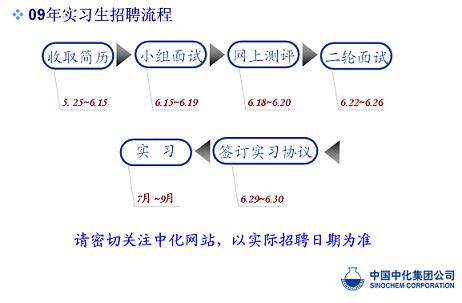 中化集团及下属中化石油中心、中化化肥中心、中化勘探公司等9家公司联合启动2009年校园实习生招聘计划,将于5月底至6月底集中开展实习生招聘面试、笔试环节。