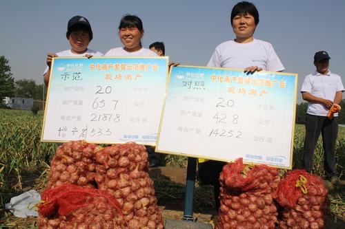 在山东昌邑市围子镇西张村,农户李鹏辉用中化螯合肥套餐技术种植大姜,亩产达到7000公斤,超正常水平2000公斤;在山东平度市兰底镇萁戈庄村,一位农户用同样技术和产品种植土豆,亩产比一般地块增加250公斤;在金乡,统计数字显示,2013年一万多亩金乡大蒜使用了中化智胜螯合肥,亩均蒜苔增产75公斤、蒜头增产200公斤,预计亩均增收800-1000元。 中化化肥正在全力推进客户导向的营销服务战略,在各地17家分公司组建农艺师队伍、构建面向农户的新型服务体系是其中的重要内容。现场种植示范等工作,能帮助农民解决实际问题,且效果直观,这种服务方式深受农民欢迎。 |