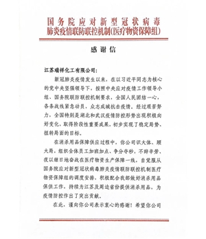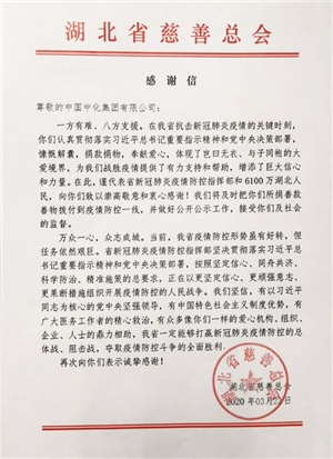 近日,国务院应对新型冠状病毒肺炎疫情联防联控机制医疗物资保障组、湖北省新型冠状病毒感染肺炎疫情防控指挥部和湖北省慈善总会分别向中化集团发来感谢信,向公司捐款捐物的举措、为各地疫情防控工作所作贡献致以感谢。国务院及湖北省有关部门给予中化集团的高度肯定离不开广大中化员工的辛勤付出,中化人将再接再厉用行动承担央企责任,为国家疫情防控持续贡献中化力量!