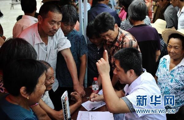 郴州(湖南),2013年6月6日 义诊进乡村 6月6日,在湖南省郴州市永兴县马田镇明星村的义诊活动现场,村民们在向医生咨询健康问题。当日,中化国际(控股)股份有限公司与当地红十字组织在湖南省郴州市永兴县马田镇明星村的博爱卫生站举办义诊活动。该博爱卫生站由中化(控股)股份有限公司于2011年捐建。自2009年以来,中化(控股)股份有限公司与中国红十字基金会合作,在我国中西部捐建了17所博爱卫生站,大大便利了当地村民“看小病”的问题。