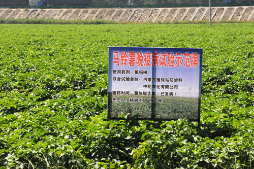 马铃薯晚疫病是典型的流行性空气传播病害,今年我国东北、华北和西北地区的马铃薯晚疫病发病早、发病重,给当地的农业生产造成了较大的影响。针对马铃薯晚疫病连年严重发生的态势,中化农化提前安排和部署,于今年2月与全国农业技术推广服务中心商定了氟吗啉防治马铃薯晚疫病的试验示范合作项目。2013年5月起,中化农化先后在云南、贵州、四川、甘肃、内蒙古建立了17个试验示范点。