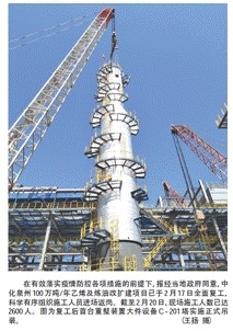在有效落实疫情防控各项措施的前提下,报经当地政府同意,中化泉州100万吨/年乙烯及炼油改扩建项目已于2月17日全面复工,科学有序组织施工人员进场返岗。截至2月20日,现场施工人数已达2600人。图为复工后首台重整装置大件设备C-201 塔实施正式吊装。