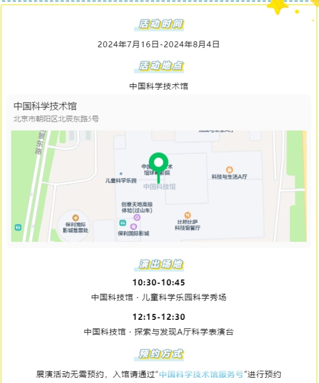 随着夏日的热情,与孩子们的欢声笑语,交织在一起。中国中化所属中国化工博物馆(简称“化博”)与中国科学技术馆(简称“中国科技馆”)携手打造的“科技馆里的化博魔法秀”系列主题展演,自7月16日起正式在中国科技馆拉开帷幕。7月16日至8月4日,两馆将联合推出40场表演,并提供上千个免费观演机会,吸引来自全国各地的小朋友们了解化学、热爱化学、探索化学。