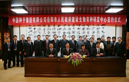 3月9日,我司下属中国种子集团有限公司(简称“中种公司”)与湖南省岳阳市人民政府在北京凯晨世贸中心召开战略合作座谈会,深入探讨合作意向、寻求合作机会。会后,中种公司与岳阳市人民政府签署了关于建设生物育种研发中心的合作协议书。根据协议,双方将以中种公司控股的湖南洞庭高科种业股份有限公司为载体,共建生物育种研发基地。 集团公司副总裁、中化股份总经理韩根生,岳阳市市委副书记、市长黄兰香等出席了座谈会和签约仪式。集团公司总裁助理、中种公司总经理张伟与岳阳市副市长陈四海分别代表双方在合作协议书上签字。(中种公司) |