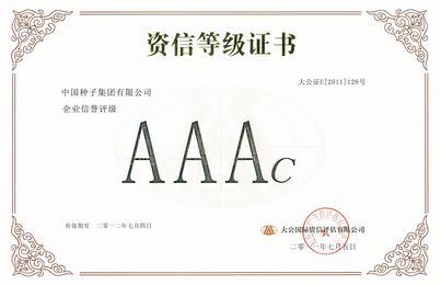 7月8日,我司下属中国种子集团有限公司(简称“中种公司”)获得大公国际资信评估有限公司(简称“大公国际”)信誉评级最高等级AAAc级。这是中国种业企业首次在企业信誉领域主动接受第三方权威评价机构评估,并获得最高等级认证。 据大公国际《中国种子集团有限公司评级报告》(以下简称《评级报告》),中种公司是我国农业产业化国家重点龙头企业,构建了较为完善的研发体系,整体科研水平较高;中种公司采用“公司+基地+农户”的种子生产模式,现有育种基地规模较大,种子加工设备自动化程度较高,拥有较为全面的营销网络服务体系。中种公司员工整体素质较高,高级管理人员和研发人员经验丰富,组织结构设置符合种业企业的生产经营特点,为提高种子生产质量和合同履行提供了机制上的保障。同时,母公司在资金、业务拓展、内部管理和研发等方面积极支持中种公司,为产业升级提供了良好的平台。 |