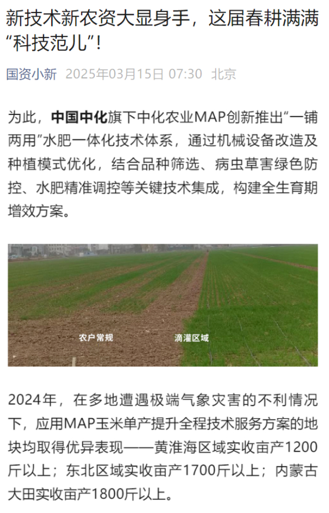 媒体聚焦 关键技术加持 提升春耕效能 今年春耕期间,国资小新聚焦农业科技新成果,提到中化农业MAP创新推出的“一铺两用”水肥一体化技术体系,该体系通过机械设备改造及种植模式优化,结合品种筛选、病虫草害绿色防控、水肥精准调控等关键技术,构建起覆盖农作物全生育期的增效方案,提升农业生产效率与质量。