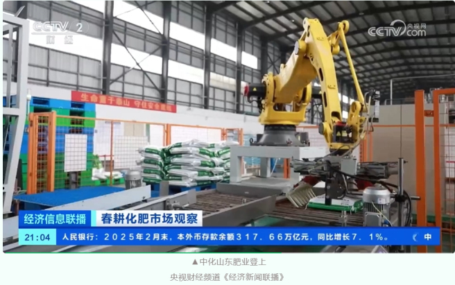 中种集团总经理宋维波在采访中表示,该平台整合全国6万多个气象站点及土壤等信息,通过创新算法模型,精准预测每一个品种最适宜的生长区域。同时,精准度达到5×5公里,为每一个玉米品种精准绘制“适生地图”。 此外,今年春耕期间,中种集团已向东北、黄淮海地区累计投放10个新品种,累计推广良种5500吨,覆盖350万亩沃野良田,进一步保障当地春耕种子供应。 媒体聚焦 加足生产马力 保障化肥供应 央视财经频道《经济新闻联播》 化肥是春耕的重要物资,当前全国各大生产企业都在开足马力,加紧生产保障供应。3月14日,央视财经频道《经济新闻联播》对此进行专题报道,重点聚焦化肥生产进度与市场价格波动情况。在中化山东肥业厂区内,12条生产线满负荷生产,复合肥、水溶肥等产品销往山东、江苏、安徽等地。中化山东肥业总经理助理单茂莹表示:“今年春耕备播期间我们保持高开工率,日均生产化肥2500吨以上,1月份至2月份产量同比增加10%。”