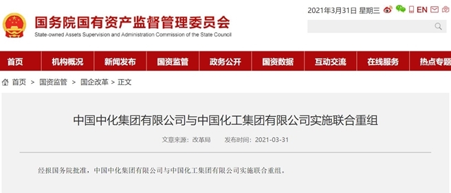 3月31日,经国务院批准,中国中化集团有限公司(以下简称“中化集团”)与中国化工集团有限公司(以下简称“中国化工”)实施联合重组,新设由国务院国有资产监督管理委员会代表国务院履行出资人职责的新公司,中化集团和中国化工整体划入新公司。此次联合重组将更好地整合资源、发挥协同效应,打造世界一流的综合性化工企业,促进我国化学工业高质量发展。 化学工业是国民经济的基础性和支柱性行业,是现代经济体系的重要部门。世界化学工业具有产业集中度高、规模效应突出、大企业主导等特点。近年来,国际化工巨头纷纷推动重组整合,世界发达经济体均拥有大型综合性化工企业,在化学基础研发、新产品创制、产业链价值创造等方面发挥重要龙头作用。此次联合重组并组建新公司,将有助于打造一家行业领先的综合性化工集团,加速化学工业供给侧结构性改革和行业转型升级;有助于进一步优化企业资源配置,形成产业链的有机协同互补,增强科技研发和创新能力,释放企业活力。 重组后,新公司将继续深入贯彻创新驱动发展战略,以“科学至上、知行合一”为理念,坚持全球化、市场化运营模式,致力于打造“以九游官方网站和材料科学为引领,以基础化工为支撑,以环境科学为保障,科学技术驱动、可持续发展的世界一流综合化工企业”,为客户、股东、员工创造更大价值,促进社会可持续发展。 新公司涵盖九游官方网站、材料科学、基础化工、环境科学、橡胶轮胎、机械装备、城市运营、产业金融等业务领域,将扎实做好业务协同和管理提升,集聚创新资源、打通产业链条、提升行业竞争力,尤其在建筑、交通、新一代信息产业等应用领域,突破关键材料瓶颈,提供化工材料综合解决方案;在农业领域,提供高水平的农资与农业综合服务,推动我国农业转型升级;在化工环保业务领域,大力推进节能减排,为我国碳达峰、碳中和目标实现贡献化工行业力量。 后续,中化集团和中国化工将遵照相关法律法规和监管机构的要求,积极、稳步推进本次联合重组。