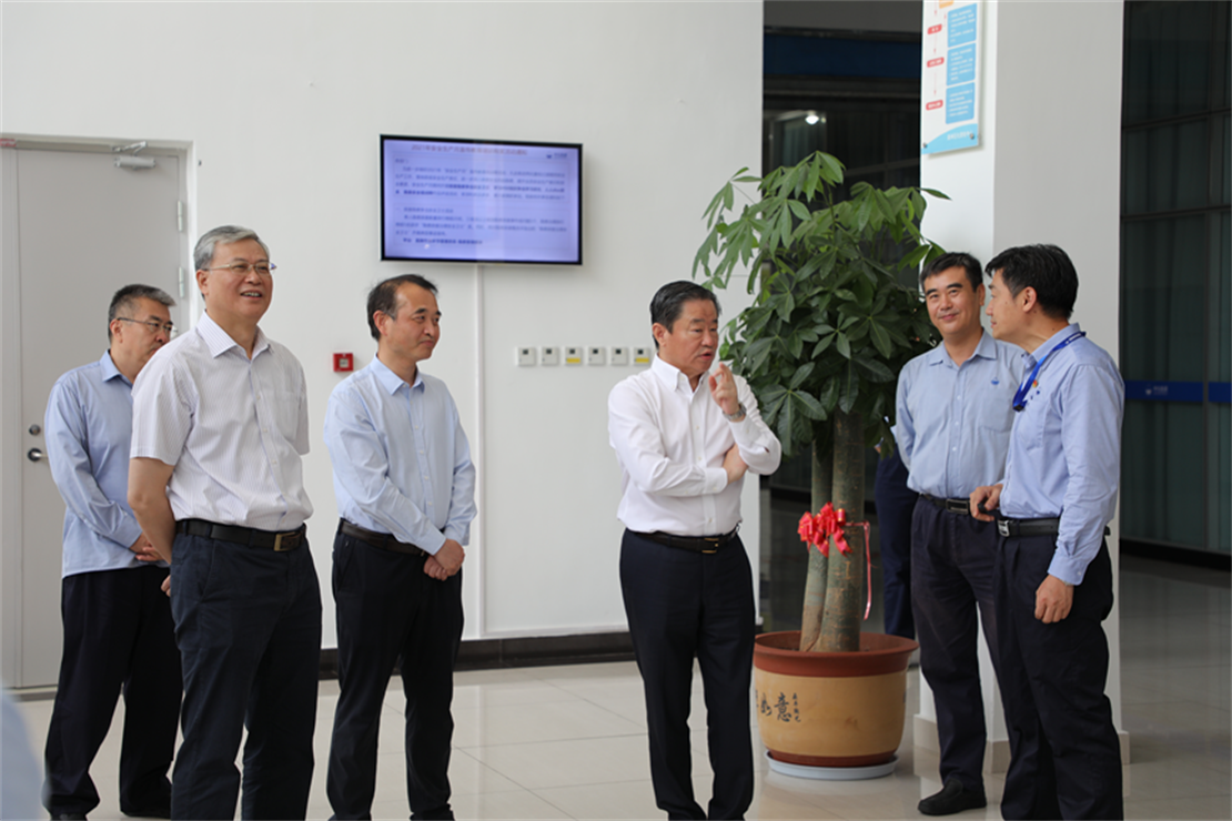图为宁高宁、李凡荣一行在乙烯项目立体库了解现有聚烯烃产品立体库的日生产负荷以及产品销售情况