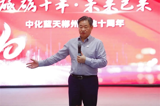 最后,宁高宁一行来到郴州基地化工分厂,调研工厂生产运营情况听取郴州基地发展现状及未来规划的汇报后,宁高宁走进CTFE装置控制室,详细了解CTFE生产装置的先进技术、工艺和产品市场地位。 此外,宁高宁、刘志仁一行出席了郴州基地十周年有关活动,为中化蓝天郴州基地司龄十周年员工代表颁奖。
