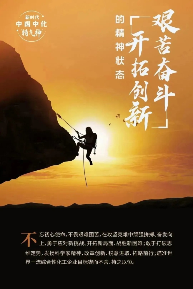 人无精神则不立,国无精神则不强。党的二十大报告强调要“弘扬以伟大建党精神为源头的中国共产党人精神谱系”“增强实现中华民族伟大复兴的精神力量”,要求发扬“奋斗精神”“奉献精神”“实干精神”“创造精神”等,提出“团结奋斗”和“三个务必”的时代要求。 为深入学习贯彻党的二十大精神,弘扬伟大建党精神,传承两化优良传统和红色基因,教育引导全体干部职工以更加昂扬奋进的姿态奋力打造世界一流综合性化工企业,中国中化党组提出塑造以“艰苦奋斗、开拓创新的精神状态;勇于担当、甘于奉献的价值取向;求真务实、真抓实干的工作作风”为核心内容的新时代中国中化“精气神”。