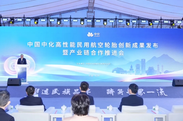 中国中化高性能民用航空轮胎创新成果发布暨产业链合作推进会现场 11月23日,中国中化高性能民用航空轮胎创新成果发布暨产业链合作推进会在桂林召开。大会宣布我国首条民航轮胎生产线全面建成投产,我国唯一复杂工况航空轮胎起降测试平台面世,并发布12款具备完全自主知识产权、可覆盖国内80%民航机队轮胎规格的创新产品。这在民用航空轮胎国产化进程中具有里程碑意义。 广西壮族自治区副主席胡帆,中国中化董事长、党组书记李凡荣,中国商飞董事长、党委书记贺东风,中国工程院院士、西安交通大学校长张立群,桂林市市长李楚,国务院国资委、工信部有关司局负责同志,以及中国民航中南地区管理局、中国国航、南方航空、东方航空等航司相关负责人出席会议。中国中化副总经理、党组成员、首席技术官张方主持会议。