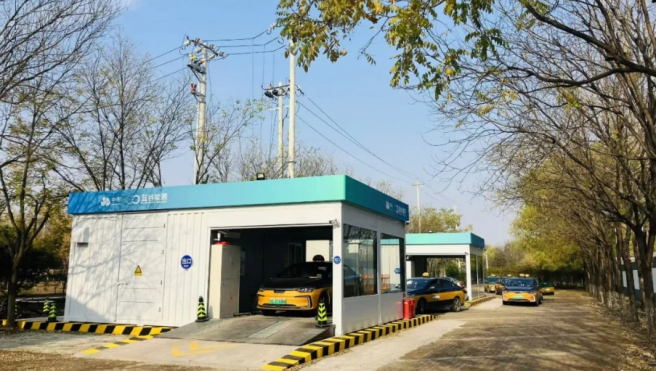 奥森北园换电站位于北京市朝阳区奥林匹克森林公园北园西门停车场内,其地理位置优越、交通条件便捷、换电环境舒适,对于北京出租车司机而言是日常换电的较好选择。 精诚合作 打造换电运营体系 2023年2月,中化新能源与北汽集团旗下蓝谷能源签订合作备忘录。双方依托各自优势,明确了在北京及其他重点城市开展经营性乘用车换电站运营、动力电池梯次利用等核心领域合作的发展方向。 签约以来,双方在选址开发、设备技术、平台操作、制度体系建立及HSE监督管理等多个领域进行深度交流,推动换电站项目顺利落地。2024年3月,双方试点合作的位于北京市顺义区津蒙大厦的联合换电站投入运营(以下简称“津蒙联合换电站”),目前已累计为广大出租车司机提供超过200万千瓦时的充电服务,获得广泛好评。“中化”牡丹花和“蓝谷能源”联合品牌形象逐渐被北京广大出租车司机所熟识。