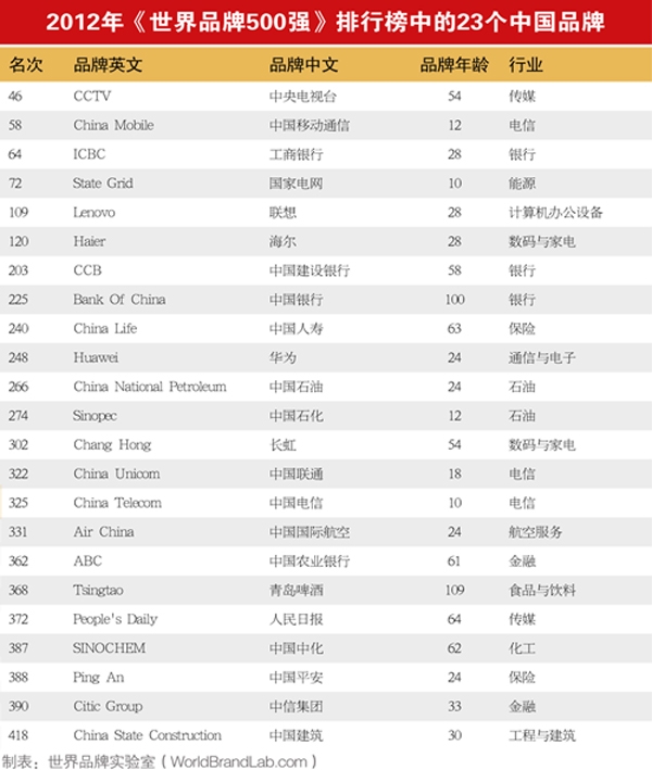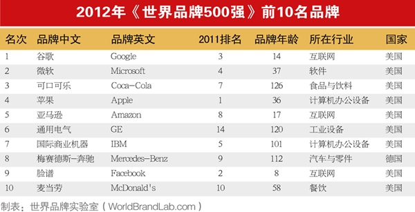 连续9年跟踪研究——2012年世界品牌500强排行榜揭晓 谷歌第一,微软第二,可口可乐第三,中国共有23个品牌入选 由世界品牌实验室 (World Brand Lab) 独家编制的 2012 年度 ( 第九届 ) 《世界品牌 500 强》排行榜于 12 月19 日在美国纽约揭晓。去年季军谷歌( Google )时隔六年终于重回冠军宝座,被评为今年的 500 强第一。今年亚军和季军由微软( Microsoft )和可口可乐( Coca-Cola )夺得。上届冠军苹果( Apple )进入“库克时代”前途未卜,今年跌到第四。上届亚军脸谱( Facebook )股票上市后一路下跌,今年跌到第九。今年中国内地入选的品牌共有 23 个,其中入围百强的品牌有 CCTV ,中国移动,工商银行和国家电网。 连九年发布的《世界品牌 500 强》排行榜( The World's 500 Most Influential Brands )评判的依据是品牌的世界影响力。品牌影响力( Brand Influence )是指品牌开拓市场、占领市场并获得利润的能力。世界品牌实验室按照品牌影响力的三项关键指标:市场占有率( Share of Market )、品牌忠诚度( Brand Loyalty )和全球领导力( Global Leadership )对世界级品牌进行了评分, 1 分表示一般, 5 分表示极强。世界品牌实验室经过长达半年对全球 8000 个知名品牌的调查分析,根据品牌影响力的各项指标进行评估,最终推出了世界最具影响力的 500 个品牌。 2012 年《世界品牌 500 强》排行榜入选国家共计 26 个。从品牌数量的国家分布看,美国占据 500 强中的 230 席,成为当之无愧的品牌王国。法国以 44 个品牌位居第二,日本以 43 个品牌入选而排名第三。在当前低迷经济形势下,欧美国家一些曾叱咤风云的品牌已经收到了严峻的挑战。排名下滑最大的品牌几乎来自美国和法国,如美国《新闻周刊》因明年停止印刷而跌出榜单,社交网站 MSN 因为老态龙钟被微软抛弃,也无缘本届品牌 500 强。 今年新上榜的品牌有 19 个,其中 4 个奢侈品,分别是宝缇嘉 (BottegaVeneta) 、杜嘉班纳 (Dolce &Gabbana) 、伊夫圣罗兰 (Yves Saint Lauren) 和巴黎世家 (Balenciaga) 。随着全球富豪人数的增多,高端百货公司中梅西 (Macy's) 和哈罗德百货 (Harrods) 首次入围。值得一提的是,中国的中信集团、中国建筑和中国农业银行等三个品牌今年首次上榜,使得中国品牌入选数量达到 23 个 , 和德国的一样位居《世界品牌 500 强》入选国家第五位。 品牌化始终是诸如可口可乐、麦当劳、沃尔玛等著名 B2C 企业的关键成功要素。现在,越来越多的 B2B 企业开始采用全方位品牌化战略,如杜邦、西门子、通用电气等公司都是品牌塑造方面的策略大师。 入选 2012 年《世界品牌 500 强》的品牌共覆盖了 50 个行业,前景黯淡的传统媒体曾一直稳坐入选 500 强品牌最多的行业宝座,今年共有 34 个媒体品牌入选屈居行业入选数量第二。而在本届 500 强评选中,食品与饮料行业共有 35 个品牌入榜 , 位居入选行业数量第一。汽车与零售行业分别有小幅提升 , 分别以入选 30 、 24 个品牌紧随其后。 牛津大学赛德商学院教授斯蒂芬·沃格 (Stephen Woolgar) 博士分析 , 中国品牌无法被外国用户接受,除了质量和设计等原因之外,在文化、语言和品牌故事等方面无法被外国消费者理解和认同是主要原因。 品牌文化是一个关于共享的故事、图像和关联的内容丰富的混合体 , 并且由消费者、公司、舆论领袖和流行文化等之间的互动来传递。跨国品牌能否被多国消费者接受,一个核心因素是文化,文化是品牌成功的钥匙,品牌征服的前提是文化征服。中国品牌要想全球化,首先是中国文化能否全球化。 互联网信息技术空前发展、新品牌营销理念及渠道革新大大缩短了世界级品牌从诞生到迅速风靡全球的时间,以前一个世界级品牌的创建至少需要 20 年以上的时间考验,如今这个过程只需要两到三年。如推特 (Twitter) 、脸谱 (Facebook) 等年轻品牌从建立至今不过 10 年的时间,却已领军全球众多著名品牌。正如 哈佛商学院教授约翰·戴腾( John Deighton ) 博士所说 ,市场营销正在面对出版发行革命,这场革命起始于内容数字化与搜索引擎的诞生 , 而企业首脑们不得不去重新学习一遍推销术。 欧美国家是现代工业的发源地,历数全球众多的“古老”品牌,美国、英国、法国、德国等国家均占据着重要比例。 2012 年度《世界品牌 500 强》排行榜中, 100 岁以上的“老字号”达 224 个。本次入选的 500 个品牌的平均年龄接近 100 岁。 耶鲁大学管理学院教授莱维·多尔 (Ravi Dhar) 博士分析,欧美一些已经死亡的品牌最近开始复活,和日本一样,中国也有很多“老字号”品牌,能否借助科技和设计而复兴,这也是摆在品牌专家和企业领袖面前的机遇和挑战。 世界品牌实验室主席蒙代尔( Robert Mundell )教授最后总结说, 人们的选择越来越多,但是进行选择的时间却是越来越少,因此品牌成为最有价值的资产。 中国的政府官员和企业高管们都在讲产业升级 , 但是各产业只有一个共同且无法回避的挑战,那就是品牌。经营品牌的能力是解决产业升级最重要的核心。 与全球主义者的去国家化的观点相反,我认为跨国品牌无法摆脱其背后的公司国籍和品牌国籍。更重要的是:一个国家的整体品牌形象作为一种战略性竞争资源,体现在跨国品牌对于国外市场份额的争夺上。如美国、法国、日本、德国等国的跨国公司在全球营销过程中,由于东道国消费者对这些国家的产品或品牌的整体认知比较积极,印象良好,使这些跨国公