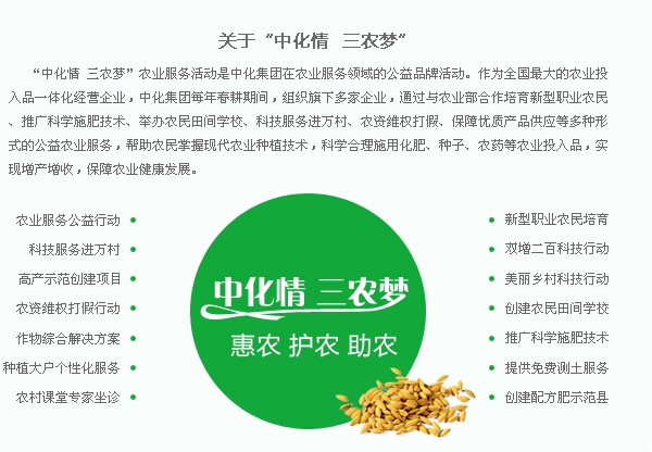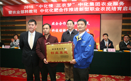 4月21日,中化集团联手农业部在山东临沂举办“中化情 三农梦”农业服务暨农业部科教司、中化化肥合作推进新型职业农民培育启动仪式。中化集团下属中化化肥有限公司(简称中化化肥)将联合农业部科教司、中央农业广播电视学校以“政企合作培育职业农民、科技创新助推现代农业”为主题,进一步探索政府、企业、院校联合开展新型职业农民培育的机制与模式。启动仪式上,农业部科教司和中化化肥对“新型职业农民创业基地”进行授牌,标志着全国第一块“新型职业农民创业基地”落户山东临沂。