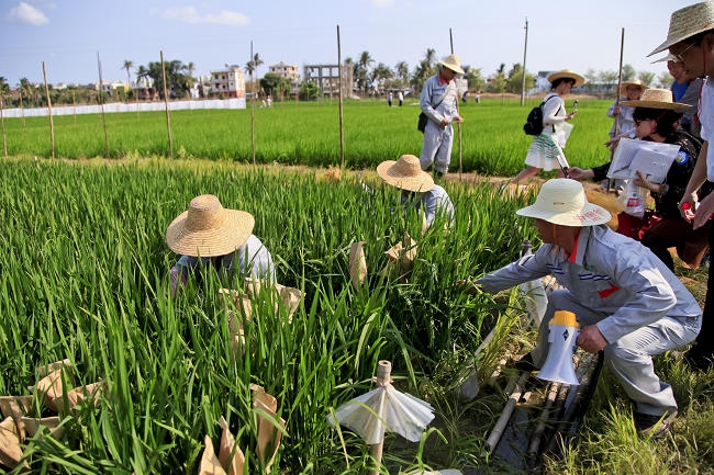 图为育种家在田间地头向网络名人、网媒记者介绍育种的技术细节 在田间地头,网络名人、网媒记者和微博网友与育种家们就南繁基地发展情况以及选育的水稻品种进行了沟通和交流。大家了解到,作为我国唯一的国家级育繁推一体化农作物种业企业,中种公司是1978年经国务院批准在原农林部种子局基础上成立的我国第一家种子企业,经过三十余年发展,现已成为集科研、生产、加工、营销、技术服务于一体的产业链完整的大型种业集团。中种公司自1978年起在海南设立分支机构,开展南繁育制种,目前基地面积已达南繁面积的10%以上,成为南繁育制种的主力军。 这是真正的体验之旅 育种是个辛苦活,育种家被称为“拿工资的农民”。在育种田里,网络名人、网络记者和微博网友穿上胶鞋、带着草帽,走进田间,在育种家们的指导下,亲身参与了插秧活动,并体会到了农事活动的艰辛和不易。