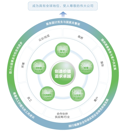 中化集团秉承“创造价值、追求卓越”的核心价值,将公司五大板块业务特点与利益相关方诉求相结合,开展“五大”责任实践,致力于成为具有全球地位、受人尊敬的伟大公司。