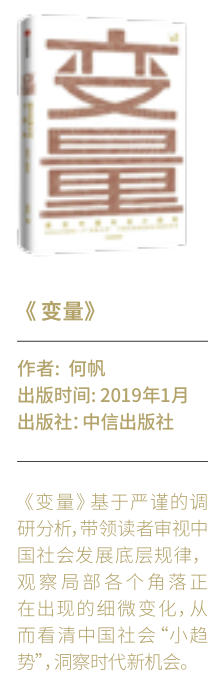 你是否听说过“鹰眼视角”?鹰,有空中之王的美誉,它搏击长空,敏捷锐利,翱翔在地面千米之上,用如望远镜一般的眼睛俯视地面——可见群山,可识微物。历史,是宏大的全局,也是生动的细节。《变量——看见中国社会小趋势》这本书,就仿佛以“鹰眼视角”解读中国。 从经济学角度观察历史,有两种变量:快变量和慢变量。快变量如同突如其来的大新闻,会在短期内引发社会变化。而慢变量通常不易察觉,却是决定一个生态系统长期走势的关键因素。越是在一个快速变化的时代,越是要把准慢变量,如此才能看透趋势。 而小趋势,则是在慢变量中出现的细微变化和规律,它发生在百万级人口群体中,创造出巨大的势能,有可能孕育出下一个时代洪流。 《变量》一书的作者为北京大学汇丰商学院教授何帆。他认为,中国这棵生长了3000年的文明大树,在2018年自下而上地展现出五个深度影响经济和社会发展的底层变量:大国博弈、技术赋能、新旧整合、自下而上、重建社群。 当下的读者站得离历史太近,容易把局部细节看成整体,把短暂波动看成长久的趋势,忽视正在萌芽的微小变量;未来的读者知道了故事的走向,但隔着久远的历史,很多细节已经模糊。因此,作者试图帮助从未来世界返回的人,展现当下正在发生、处于萌芽状态、尚未被察觉又很少见诸报端的“小趋势”,窥见历史真相。 以技术创新为例。一家无人机企业最傲人的应用案例,不在时髦发达的沿海地区,竟远在新疆天山脚下的棉田。农户采摘棉花时手指容易被扎破,受伤流血就会影响棉花品质。无人机的到来,不仅解决了这个问题,提升了产品质量,还提高了劳动效率。作者由此感叹,当技术寻找到适合、匹配的应用场景,真正抓出赋能的对象,其本身的力量才会真正爆发。 《变量》一书展现了以各种方式与时代浪潮相关联的人,面对历史的激流,他们有着不同反应状态和应对方法。他们也许没意识到,自己的个体行动代表了一种可预见未来的小趋势。当然,历史在本质上是无法预测的,现在就是一个变量。