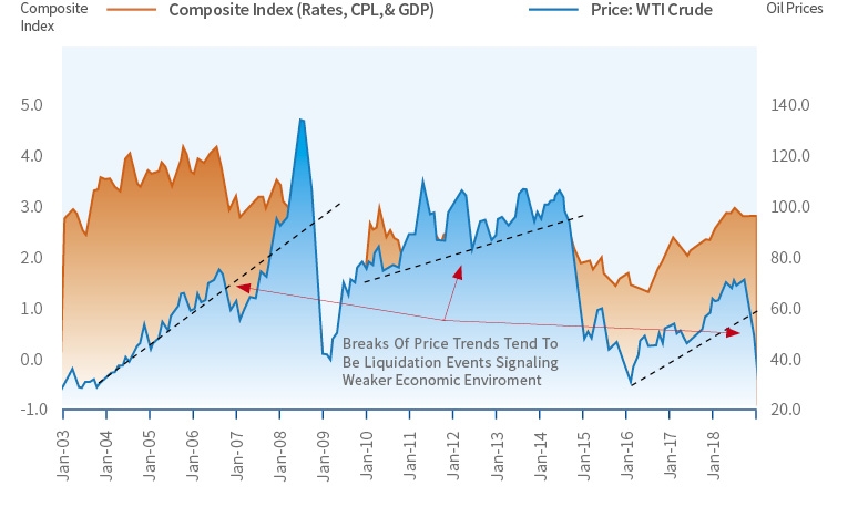 图1 (数据来源:美联储) 低油价真的好吗? 作为国际合作的中心商品,原油价格对世界经济的影响一直是一个颇具争议的话题。一般认为,高油价导致经济增速下降、引起通货膨胀等,历史上的数次石油危机都对世界经济产生了深远的负面影响。但反过来,低油价就真的好吗?毕竟从近几年世界经济走势来看,原油价格持续走低,世界经济形势并未因此好转,依然面临很大的下行风险。 以下论述皆以美国为例。图1对比了一项复合指标(综合利率、通货膨胀率和GDP三项指标)与WTI原油价格的相关性。从图中可以看出,油价波动趋势与经济走势有非常明显的正向相关性,油价的上涨/下跌与经济指标的上涨/下跌基本同步。 图2是美国5年和10年通胀率临界点和油价的对比。从图中也可以看出,油价波动与通货膨胀率的波动基本一致。核心通胀率超过2%的红线,一直是美联储加息的最重要心理关口。在2018年的大多数时间里,原油价格持续走高,美国5年和10年通胀率高于2%,就业和通胀持续向好,美联储对美国经济增长持乐观态度,先后4次加息。 换言之,在经济持续低迷、亟待刺激的现状下,油价上涨往往是石油需求增加、经济趋势向好的表现;反之,油价持续下跌则可能预示着经济提振乏力,甚至可能进入通货紧缩状态,而这是经济学家们最不愿看到的。对他们而言,通货紧缩比通货膨胀更加可怕,一旦经济进入通缩阶段,能够采取的有效调节手段少之又少。