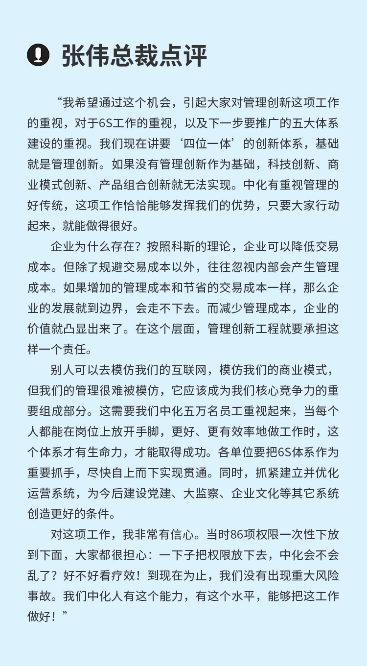 现场,观众的提问一个比一个犀利,嘉宾也直面问题、坦诚作答。现场精彩实录如下: 问:公司进入发展新阶段,为什么要进行6S体系建设?新的6S体系和以前的八大体系是什么样的关系? 张伟:这十几年我们发展得很好,得益于十年前做出的两个非常重要的决定:一个是2007年金茂上市,成为一个独立的板块;另一个是十年磨一剑,建设泉州石化。这两块业务2017年加起来有上百亿利润,集团2017年利润130多亿。如果十年前没有作出这样的决策,没有付出十年的努力,2017年中化不会有这样的成绩。 过去中化在管理上是成功的,符合企业当时的发展阶段。但现在环境改变了,我们面临着更大挑战,尤其是互联网信息技术的发展。腾讯1999年成立,现在市值上万亿。而我们1998年搞管理改善工程,虽然走出了困境,实现了发展,但在速度上与腾讯不可同日而语。所以,现在这种竞争格局,需要我们快速变革。 目前,再由总部对五大事业部直接进行管理,已跟不上市场的变化,我们必须要使业务部门更加迅速地响应市场,去跟对手竞争,去更好地创新。这种情况下,我们决定把业务运营的管理职能,甚至一部分战略管理权限下放到事业部,总部业务集中在战略管控、投资控股层面。在这种大背景下,我们启动了管理创新工程,今天讲的6S,就是整个管理创新工程第二阶段的主要内容。 现在提出的五大体系,包括党建体系、大监督体系、6S体系、企业文化体系,再加上运营体系,对应原来的八大管控体系。其中,6S体系是战略管控的主要抓手,但不是管理体系的全部。 特别要说的是,制度如果仅仅是写成条文,就不能称其为制度,也不能称其为一个体系。只有所有人都认同的时候,它才成为一个制度、体系,才能发挥作用。红绿灯,为什么有的国家就遵守得很好,有些地方就做得不好?规则都是一样的,在于人们是否遵守。所有人都去遵守,红绿灯的作用就发挥出来了,只要有人不遵守,红绿灯的效果就不行。 我们建立6S体系很有必要,虽然今天6S还不完美,但如果大家认同它,共同努力完善它,就能把6S做得更好,使它成为中化核心竞争力的一个重要组成部分。
