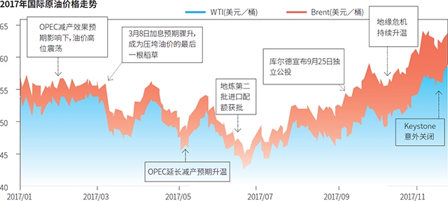 2017年,全球经济复苏进程从缓慢到步入正轨,各国宽松货币政策出现转折,石油市场变革也拉开新篇章的序幕。 2017:石油市场再平衡加速,国际原油价格实质性回升 国际原油价格于2016年完成了底部的初步建立,2017年呈现“V”形走势,布伦特油价涨至两年来新高,达65美元/桶上方。 截至2017年12月15日,WTI原油均价50.85美元/桶,比上年提高7.38美元/桶;布伦特原油均价54.74美元/桶,比上年提高9.61美元/桶;布伦特—WTI价差自2016年最低点-0.87美元/桶回升至6.26美元/桶,体现出油市局面的改善。 2017年,欧佩克减产及全球原油去库存情况主导油市行情。欧佩克减产效果明显且减产履约率创历史新高,1—11月整体减产履约率达到91%,非欧佩克国家减产履约率约为70%。11月30日,欧佩克与非欧佩克将减产协议延长9个月至2018年年底。 另一方面,美国原油产量比2016年低谷增加120万桶/日,11月达到968万桶/日,加上利比亚、尼日利亚和伊朗的增量,基本对冲了欧佩克和非欧佩克的全部减产量。全球原油边际供应量虽未实质性下降,但由于需求端的自然增长,油价中枢比2016年仍实质性抬升。 2017年全球经济增长3.6%,国际货币基金组织形容为“十年来从未有过的全面恢复势头”,从而拉动石油需求增长。国际能源署、美国能源信息署和欧佩克预估2017年石油需求增量的均值为146万桶/日,其中,中国原油进口需求强劲,1-11月原油进口量同比增长12%,达841万桶/日,将取代美国成为世界最大原油进口国。 自从减产协议达成后,全球原油市场明显进入了去库存的“快车道”。截至2017年10月底,经合组织商业石油库存下降到29.40亿桶,虽然仍比五年平均水平高1.11亿桶,但已同比降低1.8亿桶。 美国商业原油库存4.48亿桶,同比下降7.75%,处于3年来较低位置。全球浮仓库存明显下降,东南亚与波斯湾浮仓降幅近50%,西北欧浮仓基本出清。此外,石油市场收紧的信号还体现为布伦特期货价格走势从维持已久的“期货溢价”(contango)转为“现货溢价”(backwardation),将有助于库存进一步下降。 近几年原油市场对地缘风险或突发事件呈现“免疫”状态,油价几乎没有反映此类风险。然而,随着供需平衡趋紧,市场对此类事件作出更为强烈的反应。2017年9月以来,全球供需基本面并未显著改变,但是受伊拉克库尔德地区独立公投、美国Keystone管道漏油等事件的影响,风险溢价加大,国际油价暴涨。 2017:我国炼油行业多元发展,成品油需求增速略有回升 我国炼油产能不断提高,2017年达8亿吨,比十年前翻了一番,形成了以中石油、中石化为主,中海油、中化、中国兵器、独立炼厂等多元化发展格局。 2015年放开“双权”以来,独立炼厂获得发展新机遇,在国内炼油总产能中的占比从2015年的22%上升至2017年的26%。虽然油品质量升级和环保督查在某种程度上影响了部分炼厂的开工负荷,但因2800万吨一次产能投产,国内成品油供应依旧保持稳健。得益于国际油价回升,炼油行业维持高景气度,炼油企业盈利能力持续提升。 2017年国内成品油消费量呈现中低速增长。预计全年成品油消费量为3.2亿吨,较上年增长3.4%,全年原油加工量5.68亿吨。炼油产能过剩已成不争事实,约剩余1.6亿吨。 外资和民营积极进军成品油销售终端建设,加油站销售环节竞争日益激烈,价格战一度硝烟弥漫。产能过剩继续拉动成品油出口,虽然国家控制下发成品油出口配额,1-11月成品油出口仍达到4610万吨,数量同比增长7.3%,金额同比增长42%,成为缓解国内油品供需失衡、提高炼厂利润的重要途径。 2017:国内油气体制改革进程加速,市场化导向突出 2017年,油气行业推进供给侧改革,油气体制改革快速展开。《石油天然气体制改革总体方案》出台,相关实施细则和配套政策加紧制定,以放开准入为重点的行业改革在试点基础上加快推进。 上游勘探开发领域围绕矿权制度推进改革;油气储运领域网运分开,扩大第三方公平准入;成品油价格机制将发挥市场决定价格的作用;围绕油气交易中心的投用,市场体系建设加快等。