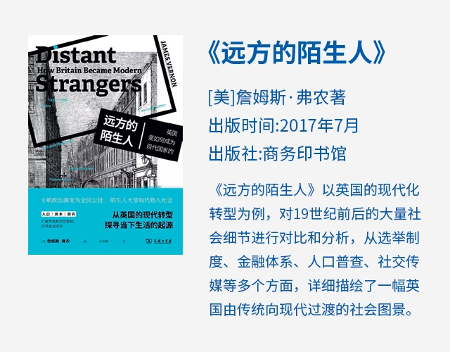我们该如何辨别一个人是否“现代”?他们又是什么时候变得“现代”?其实,“变得现代”,本身就是一个过程。它是社会模式漫长的变迁积淀,你几乎无法察觉。《远方的陌生人》作者詹姆斯·弗农,是加州大学伯克利分校历史系教授,专注于现代英国史、大英帝国史及全球化研究。这本书要探讨的就是18世纪中期到19世纪晚期,英国如何完成从熟人社会到陌生人社会的“现代转型”。 亚当·斯密认为:我们在熟人面前,往往比在陌生人面前更容易做出不端行为。因为你总认为,亲友会容忍你。这导致了整体人口的道德感大打折扣。相反,陌生人在彼此交往中却能生发自律的道德规范,契约精神。换言之,它的核心是社会关系的抽象化,我们不再考虑对方是谁,不必在意私人关系的亲疏,按公共关系也能达成自己的目的。 作者认为英国进入陌生人社会有三大助推力:人口迅速持续增长,超大规模的城市化,人口在更广范围内的流动性。前两条让城市有了“密集恐惧症”的症状,所以又依赖第三条来解决。它催生了交通运输的“大革命”:如大大改善的道路设施、交通网络以及火车汽船的应用。移民成为“新常态”,甚至和帝国主义挂上了钩,出现了移出英国的新趋势。 此书的深刻处旨在描述一种辩证化的“重塑论”。“英国进入陌生人社会”这一最大现实,让旧的生活模式、政治治理面临“报废”,急需重塑新的社会组织形式。如在城市、街道等公共生活里,陌生人邂逅需要掌握安全、体面的行事方法,一套都市生活的教养礼数应运而生。家庭生活则更看重隐私管理,不断剔除外人(雇员、学徒、家庭教师、仆人)和外戚,把工作场所和居住空间区隔开来,逐渐形成了“核心家庭”(只有父母和子女维系的家庭)。 陌生人社会也重塑了政治治理新模式。精确系统化的人口普查让英国开始以抽象形式(数据)治理臣民。英国的税收标准化操作,让人觉得公平公正。然而,人们相信的并不是收税官,而是合理的程序,标准的工具。文官系统则把官僚程序变成一种职业方式,标榜致力于“公正的服务事业”。所谓的“通才”就像机器的控制系统,“专才文官”则像机器的操作系统。每个人却很难发挥主观作用,他们都不过替代官僚系统运行而已。作者揭示的“国家权力抽象化,国家机器匿名化”的政治转型,就是福柯描绘的现代社会的“微分权力”。它没有形象,看不见摸不着,却无处不在。前现代国家权力的那种“人格特征”,早已消失殆尽。 |