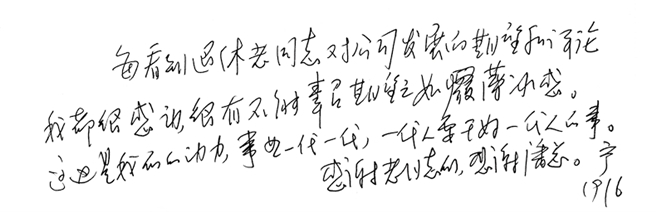 编者按: 不久前,集团党组收到离退休干部党总支发来的一封特殊来信,宁高宁董事长读罢信件后特意写下长长一段话。那么,宁总是如何批示的?老干部到底在信中写了什么?现将批示和来信全文刊登如下,与全体中化人共勉。