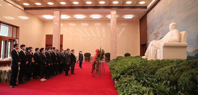 4月16日上午,中化集团办公室第一党支部集体赴毛主席纪念堂主题党日活动,瞻仰毛主席遗像,深切缅怀伟大领袖,重温革命历史。中化集团党组书记、董事长宁高宁,党组成员、副总经理阳世昊参加活动。 支部全体参与党员跟随引领员来到毛主席纪念堂北门,面向场馆排成两纵队。在庄严肃穆的气氛中,纪念堂的大门缓缓打开,队伍拾阶而上,向毛主席像敬献花篮。宁高宁细心地整理花篮上的缎带,全体人员面向毛主席像三鞠躬,随后列队缓步前行瞻仰毛主席遗容,缅怀伟大领袖。