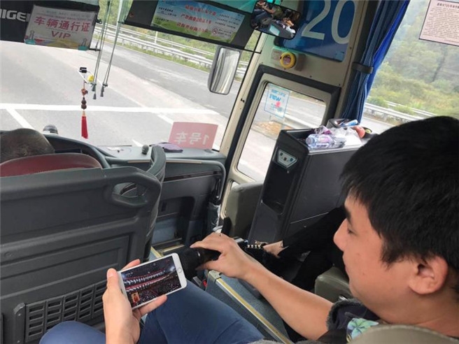 刚刚下了夜班的中化蓝天员工在公司班车上观看十九大开幕式直播 |