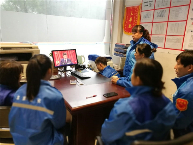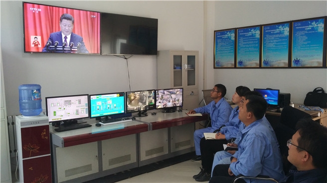 中化节能环保公司员工在项目中控室利用工作间隙收看十九大开幕式直播
