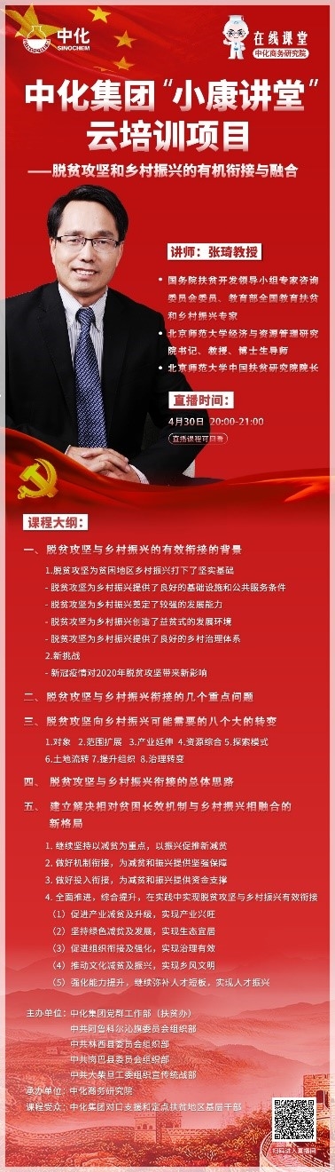 为进一步贯彻落实习近平总书记在决战决胜脱贫攻坚座谈会的重要讲话和指示精神,提升中化集团对口支援和定点扶贫地区基层干部精准扶贫、精准脱贫能力,解决受援地因疫情影响无法开展线下集中培训的难题,中化集团着力创新方式,启动中化“小康课堂”云培训项目,利用在线直播无偿为受援地基层干部开展培训工作。此次培训由中化集团党群工作部(扶贫办)联合定点扶贫地区内蒙古阿鲁科尔沁旗委组织部、林西县委组织部,对口支援地区西藏岗巴县委组织部、青海大柴旦区委组织宣传统战部共同主办,集团下属中化商务研究院具体承办。 中化“小康讲堂”第一期隆重邀请到国务院扶贫开发领导小组专家咨询委员会委员、教育部全国教育扶贫和乡村振兴专家,北京师范大学经济与资源管理研究院书记、教授、博士研究生导师,北京师范大学中国扶贫研究院院长——张琦教授,为大家讲授《脱贫攻坚和乡村振兴的有机衔接与融合》。张教授长期从事农村扶贫脱贫和区域经济发展研究,主持国家社科基金重点项目、教育部重大项目和国家十三五规划前期研究重大项目等有关扶贫脱贫的国家和省部委研究课题80多项,出版专著30余部,发表论文300余篇,是我国知名土地政策和扶贫研究专家。 我国脱贫攻坚取得了哪些伟大成就?脱贫攻坚为贫困地区乡村振兴打下了怎样的坚实基础?今年初的新冠疫情对2020年脱贫攻坚带来何种影响?如何建立解决相对贫困长效机制与乡村振兴相融合的新格局?张教授将一一解答,欢迎广大脱贫攻坚战线上的同志们前来“围观”,届时可直接通过手机扫描海报二维码进入直播间参与课程培训,精彩内容,敬请期待!