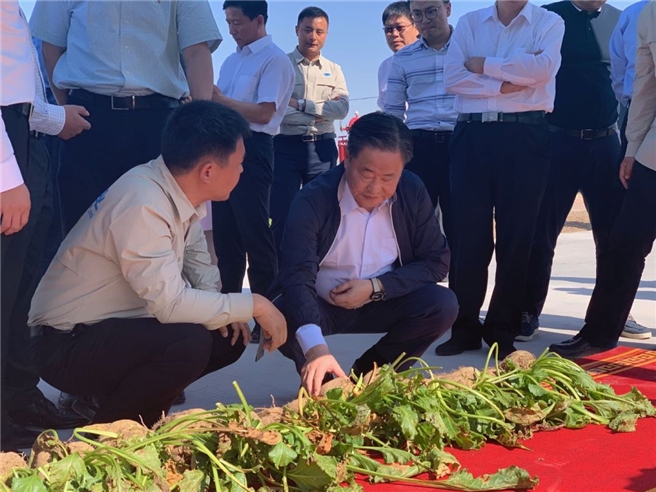 宁高宁一行调研中化集团投资建设的MAP甜菜扶贫农场 随后,宁高宁来到天山镇房身村中化集团投资建设的MAP甜菜扶贫农场,该项目是中化农业与扶贫密切结合的示范产业项目,由房身村成立农民专业合作社,整村流转土地,种植甜菜1700亩,中化农业专业技术团队实施种植托管,提供涵盖选种配肥、植保检测、技术培训、订单助销等全链条服务。负责运营服务甜菜扶贫农场的中化农业阿旗技术服务中心人员向宁高宁汇报了“MAP+扶贫”模式的运作机制,该模式壮大了农村合作社,培训提升了农民种植技术水平,同时贫困户分享了土地租金、劳动报酬及合作分红三重收益,单亩增收超过500元。 宁高宁在听取汇报后肯定了“MAP+扶贫”模式及中化农业技术服务团队在甜菜种植方面取得的成效,指出糖业具有大宗商品金融属性,容易受市场因素影响造成价格波动,要想抵御风险就需要真正下功夫聚焦种植技术及效率的提升。
