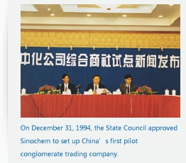 Based on experience in international operation and taking the reference to conglomerate trading companies in Japan and Korea, Sinochem came up with the idea of experimental conglomerate trading company. On December 31, 1994, the State Council permitted the company to establish the first experimental conglomerate trading company in China and to include China Foreign Economy and Trade Trust Co., Ltd. (FOTIC) as one of its affiliates, with an aim to establish an international, industrialized, diversified and group-like comprehensive trade company that integrates such functions as trade, manufacturing, technology, finance and information.