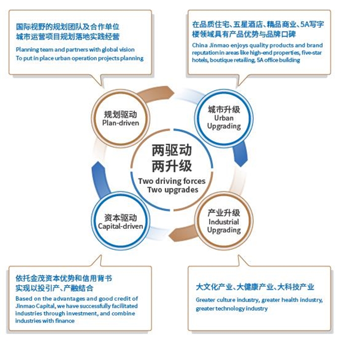 Drawing on the experience and advantages on city operation, China Jinmao keeps innovating city operation model of “two driving forces and two upgrades”. Driven by the two forces of planning and capital, it upgrades city functions and industries, assisting government in building new city cores.