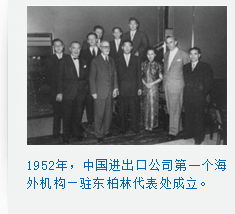 1952年4月3—12日在莫斯科召开的国际经济会议,对反“封锁”“禁运”产生了一定影响。中国代表团成员中国进出口公司卢绪章经理参会期间,同30个国家和地区的100余位工商人士进行广泛接触,并与英、法、西德等11个国家和地区的客户签订了总额达2亿多美元的贸易协议和合同。同年夏天,公司在东柏林设立代表处,作为我国对外贸易的窗口,开始逐步建立与西欧国家的贸易关系。