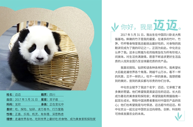 此外,中化农业在我国四川卧龙大熊猫基地认养了一只大熊猫,取名迈迈,并让它代言“熊猫指南”。