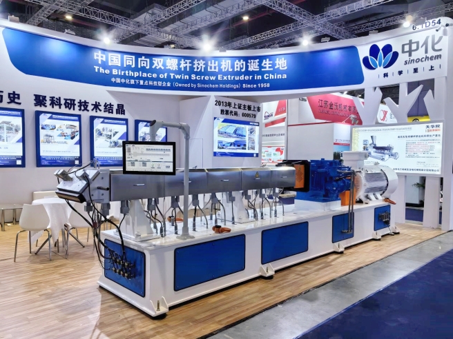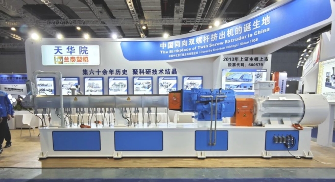 展会现场,天华院还重点展出其创新研发的聚合物脱挥挤出机。该设备利用高效的传质传热能力,可广泛应用于聚合反应后脱出溶剂、未反应单体及低聚物等的工艺过程。