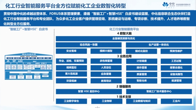 化工行业智能服务平台:化工行业智能服务平台可为众多化工企业客户提供管理咨询、系统建设与运维、专项诊断、技术提升、人才培养等数智化转型全方位服务。中化信息所属蓝星智云针对化工生产的特点,从工艺分析入手,全方位覆盖化工企业生产过程的感知、分析、安全、控制、优化及培训等领域。目前,化工行业智能服务平台已全面服务支撑中国中化“智能工厂+智慧HSE”建设应用,并向行业输出推广。