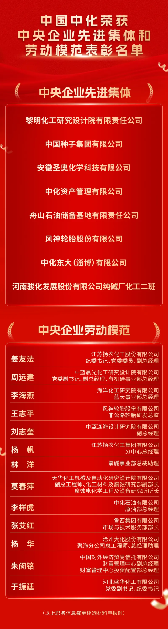 9月26日,中央企业先进集体和劳动模范表彰大会在京举行。中国中化所属黎明院、中种集团、圣奥化学、中化资产等8个集体获得“中央企业先进集体”称号,海化院李海燕、风神轮胎王志平、中蓝连海刘志奎、扬农集团杨帆等13名个人获得“中央企业劳动模范”称号。